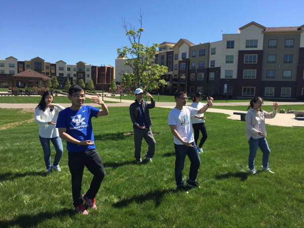 天气晴好的时候,同学们也会相约在公寓旁的草坪上合体锻炼,动作整齐划一,吸引了国际员工驻足欣赏,不少职工还积极学习、共同参与,加入到练习太极拳的队伍中。
