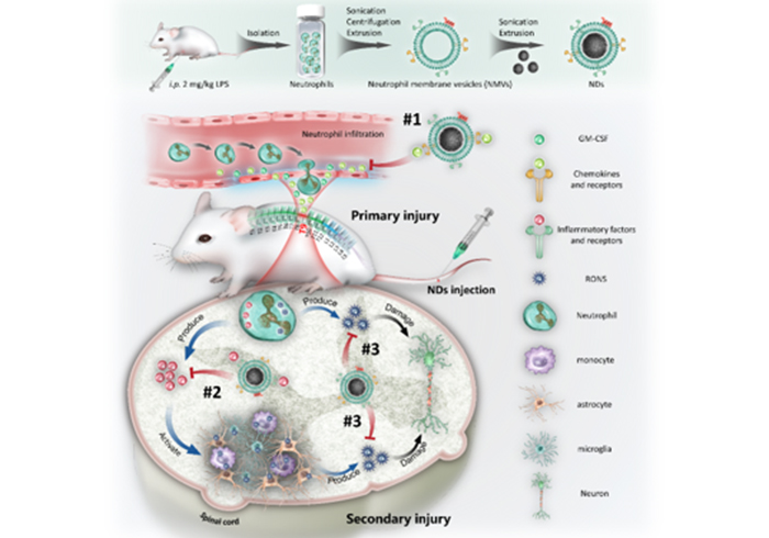 研究表明,NDs以活化的中性粒细胞细胞膜为外壳,其继承了多种“亲代”中性粒细胞膜表面的受体,从而可以吸附并中和中性粒细胞相关炎症因子和趋化因子。此外,以聚多巴胺纳米颗粒(polydopamine nanoparticles,PDA NPs)为内核的NDs还可高效清除神经元内过度产生的RONS,保护其免受氧化损伤。在大鼠SCI模型中,早期给予NDs治疗显著降低了损伤脊髓内的中性粒细胞浸润并重塑了炎症和氧化微环境。在SCI慢性期,NDs降低了脱髓鞘和胶质瘢痕形成,促进了SCI大鼠的神经功能恢复。研究成果为应对继发性脊髓损伤提出了新策略。