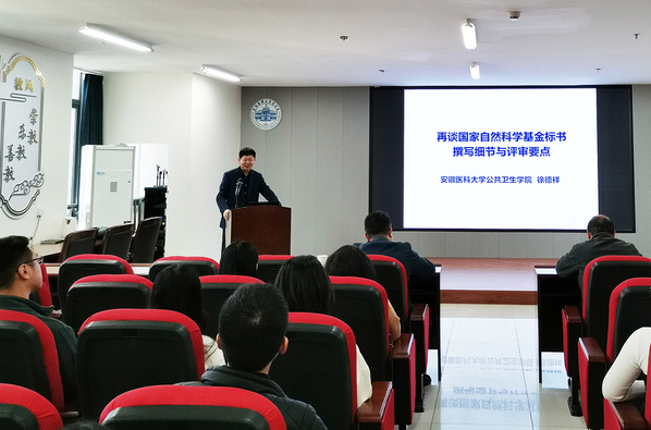 徐德祥在题为《再谈国家自然科学基金标书撰写细节与评审要点》的专题辅导报告中,从基础医学科研的特点和方法出发,阐述了医学领域“国自然”选题的基本原则,详细解析了标书撰写的要领和细节。他结合自己多年的申报和评审经验,分享了新时期“国自然”申报与评审的新要求和新思路,并通过具体案例深入分析了青年教师如何实现从青年项目到面上项目,再到重点重大项目的衔接和升级。报告结束后,徐德祥与青年教师互动交流,就申请代码的选择、研究方向的规划等问题进行深入探讨。