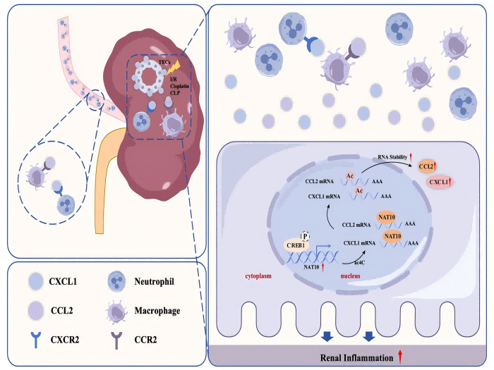 该项研究工作揭示了mRNA ac4C乙酰化修饰在急性肾脏炎症中的重要功能及分子机制。研究发现,肾小管上皮细胞中NAT10通过同时介导CCL2、CXCL1 等多种炎症趋化因子的mRNA乙酰化修饰,促进其转录本稳定性,进而招募循环巨噬细胞和中性粒细胞等炎症细胞聚集,介导肾脏炎症微环境形成。NAT10可能作为肾脏炎症调控的关键“开关”促进急性肾损伤的发生发展。